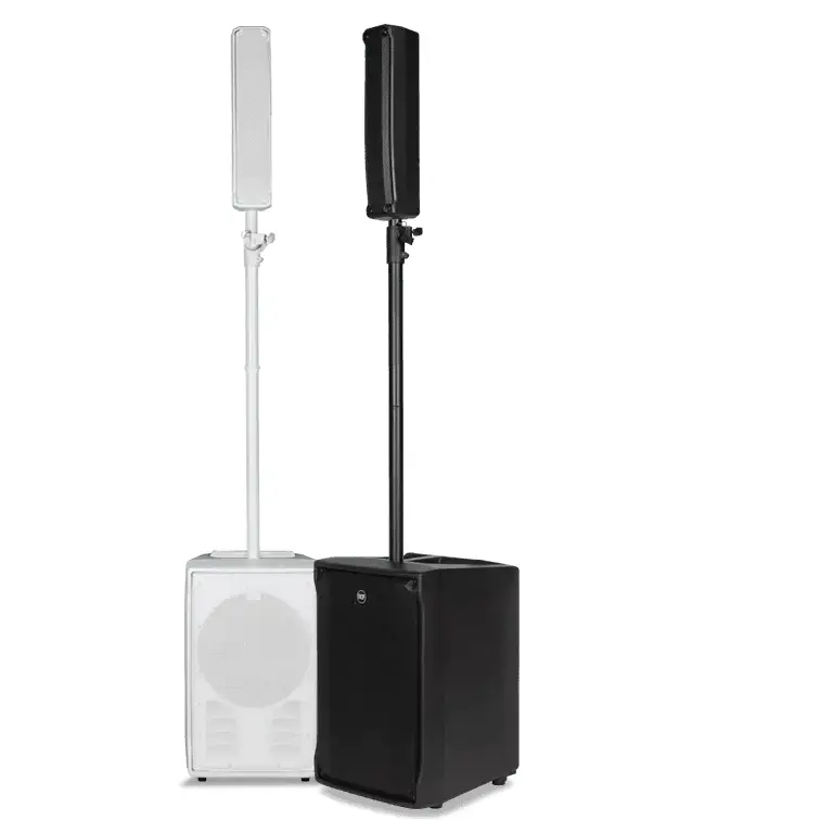 قابلیت حمل: علاوه بر دسته بالای کابینت ووفر، حمل و نقل به لطف چرخ دستی که کاملاً در پوشش اختیاری بلندگو ادغام شده است، آسان میشود. در هنگام حمل و نقل، میله فلزی به طور ایمن با دستههای پوشش به چرخ دستی متصل میشود.